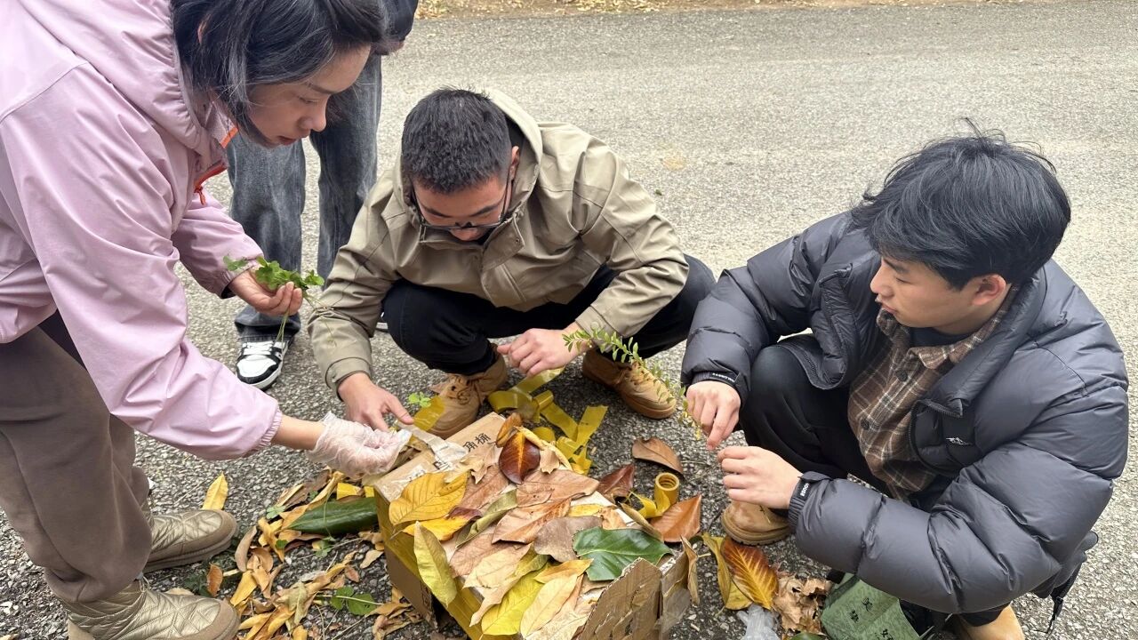 青年们利用硬纸板、落叶、枯枝等废弃物,