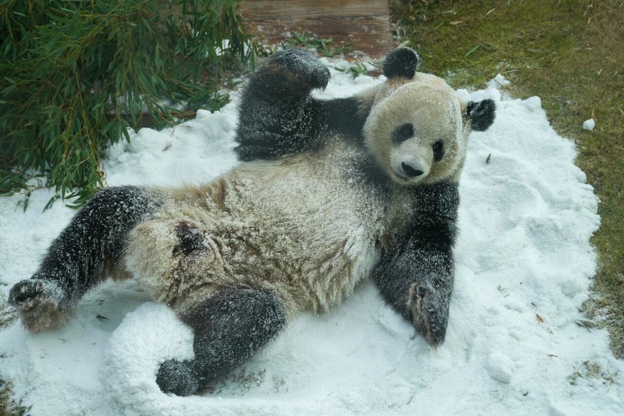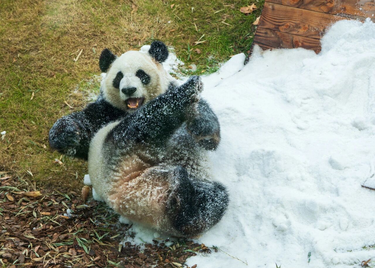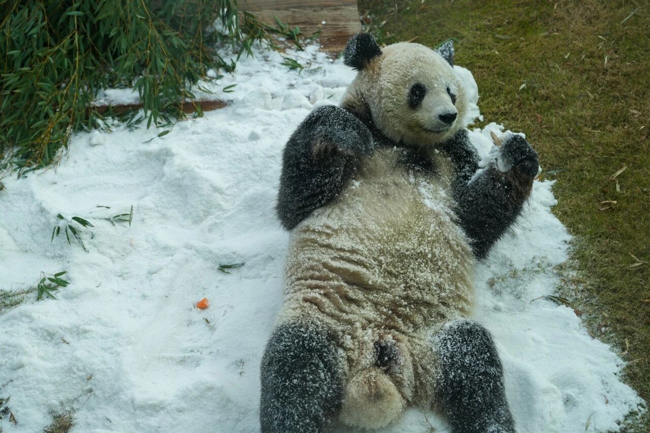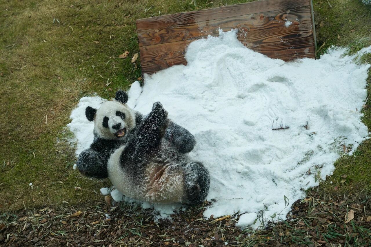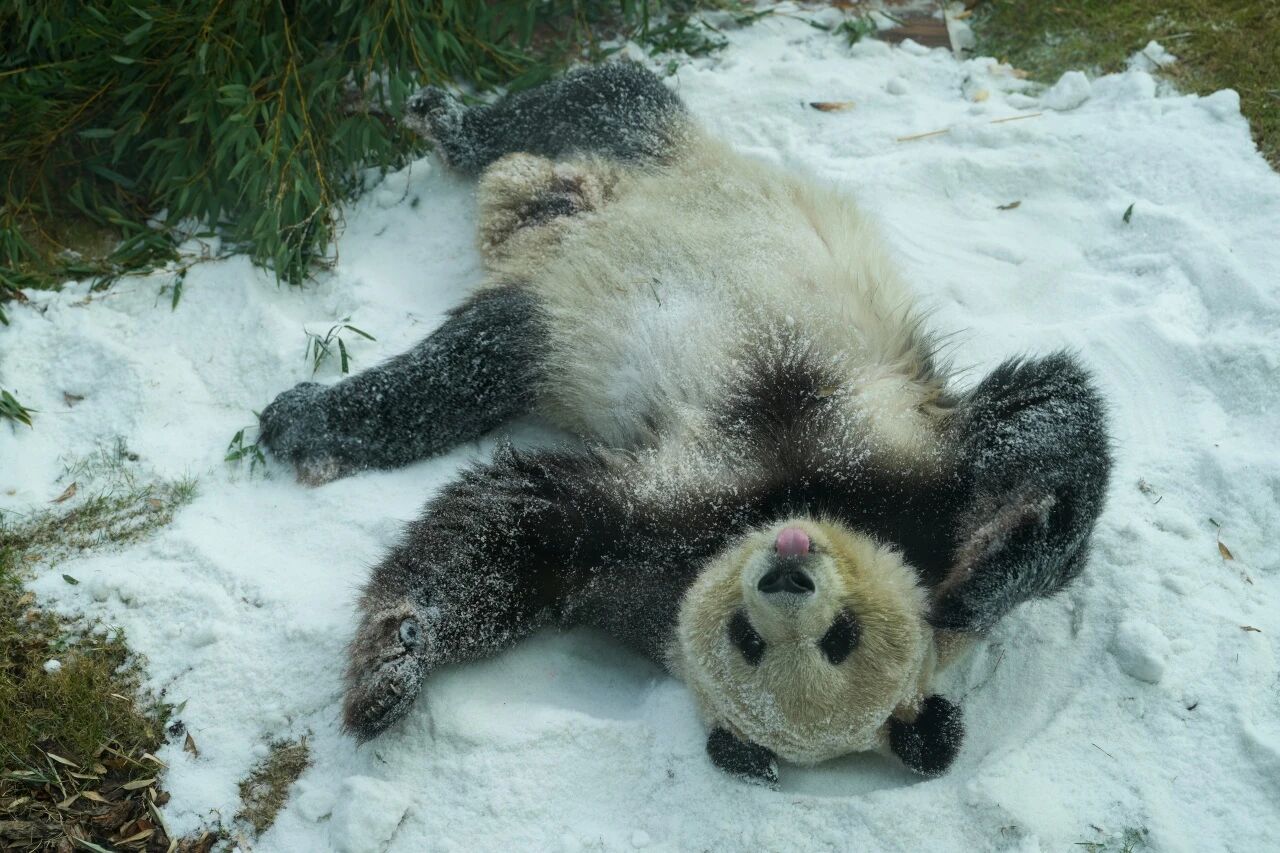 渝宝一见到雪地就兴奋地打了个滚,