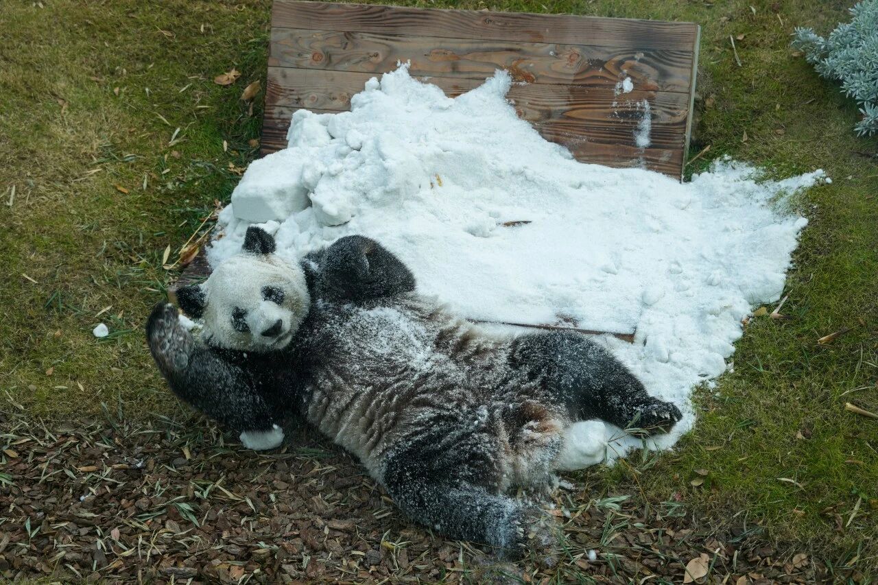 但动物园的保育团队把洁白的“初雪”铺满了熊猫的外场。